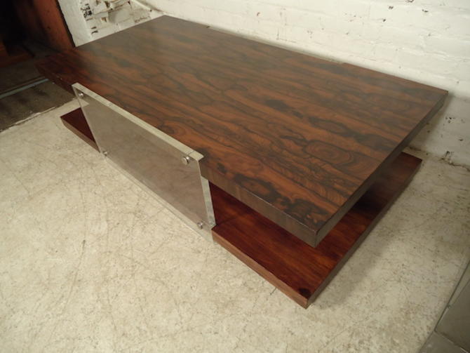 This large coffee table is made of chrome and lucite with two glass shelves, beveled on top glass.